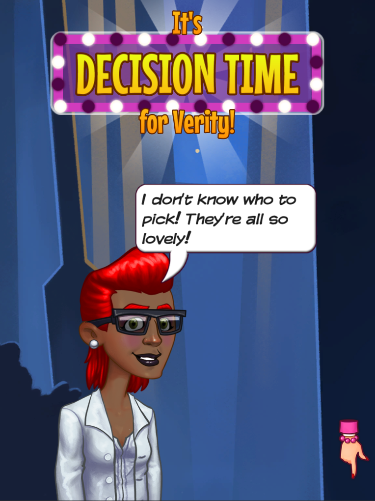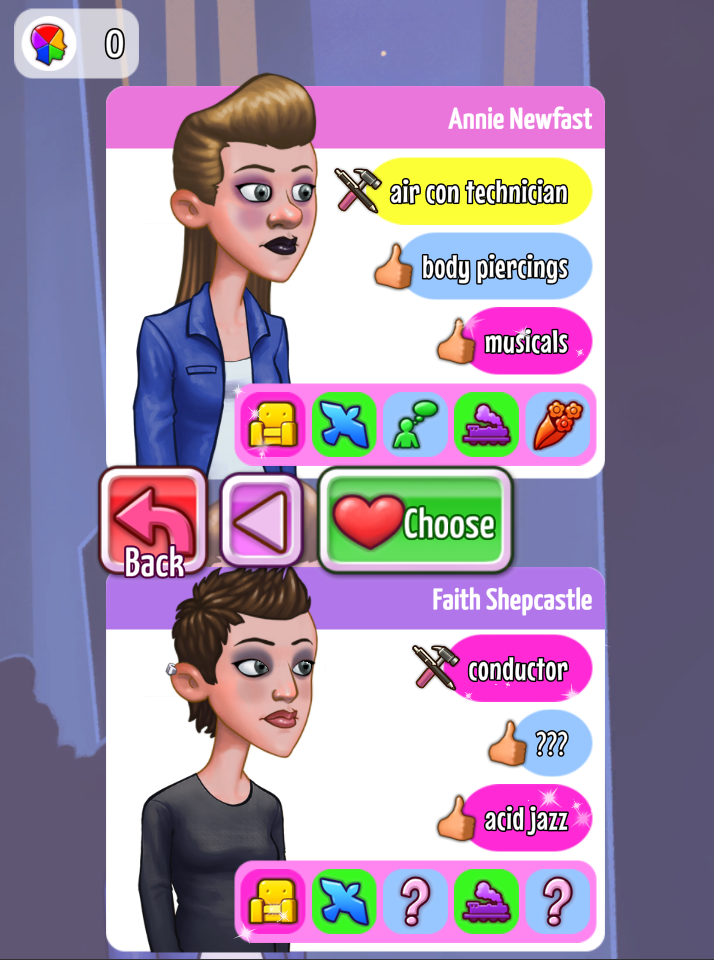 Anyway, let me carry on filling you in with all the delightful details of Kitty Powers’ Speed Date! At the end of every speed dating event, you’ll be presented with a list of the best potential matches that you made (up to a maximum of eight), then you’ll have to pick which one is the best of the best! You do this by comparing the characters and their likes and dislikes in the profile comparison screen! The more information you’ve revealed about each character, the easier it will be! Hurray!